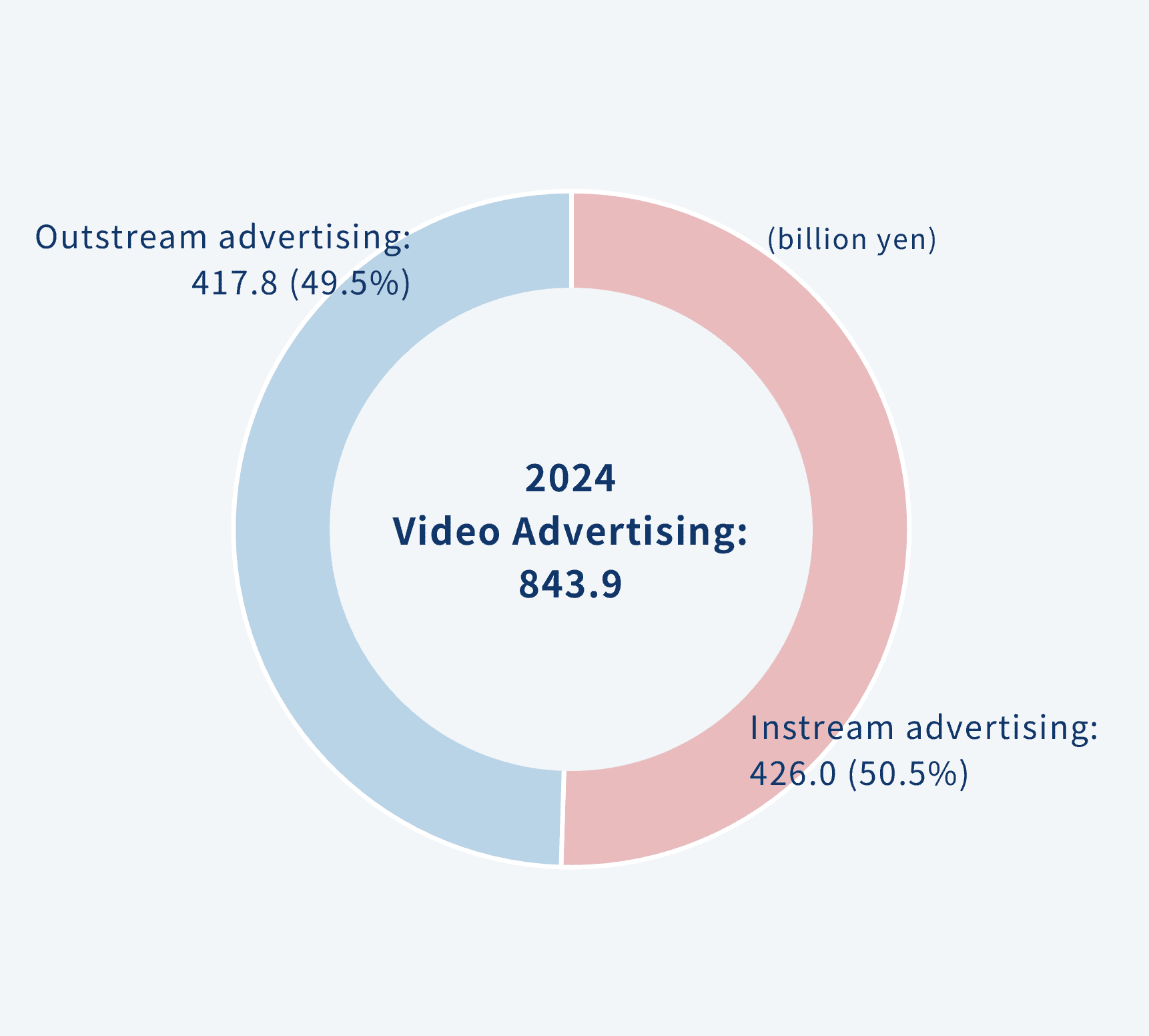 Video advertisements grew 23.0% year on year to 843.9 billion yen, the highest growth rate among all ad categories. Instream advertising amounted to 426.0 billion yen (50.5% of the total), almost the same as outstream advertising, at 417.8 billion yen (49.5% of the total).