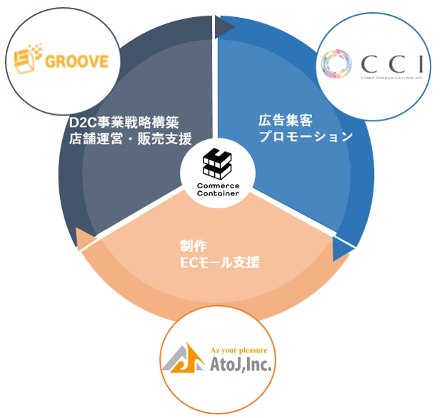 株式会社CARTA HOLDINGSのグループ会社である株式会社サイバー・コミュニケーションズ(本社:東京都中央区、代表取締役社長:新澤 明男、以下 CCI) は、企業のEC販売戦略を支援するサービス「Commerce Container」(コマースコンテナ) の提供を開始します。 本サービスは株式会社GROOVE(以下 GROOVE)、株式会社エートゥジェイ(以下AtoJ)とともに、各種ECモール全般における販売戦略構築から制作、運用及び分析までをワンストップで支援します。