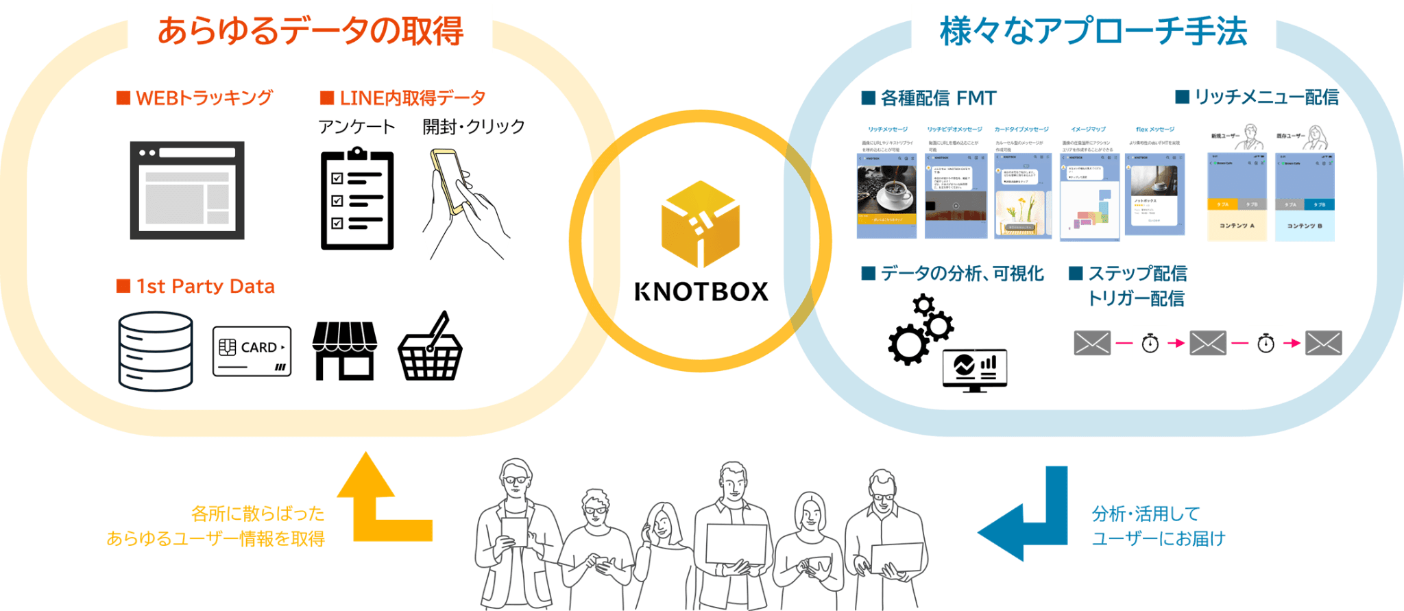 「KNOTBOX」では、LINE公式アカウントとAPIで連携し、様々なデータの取得・活用を行うことで、企業とユーザーの繋がりを作り、最適なコミュニケーションを実現いたします。