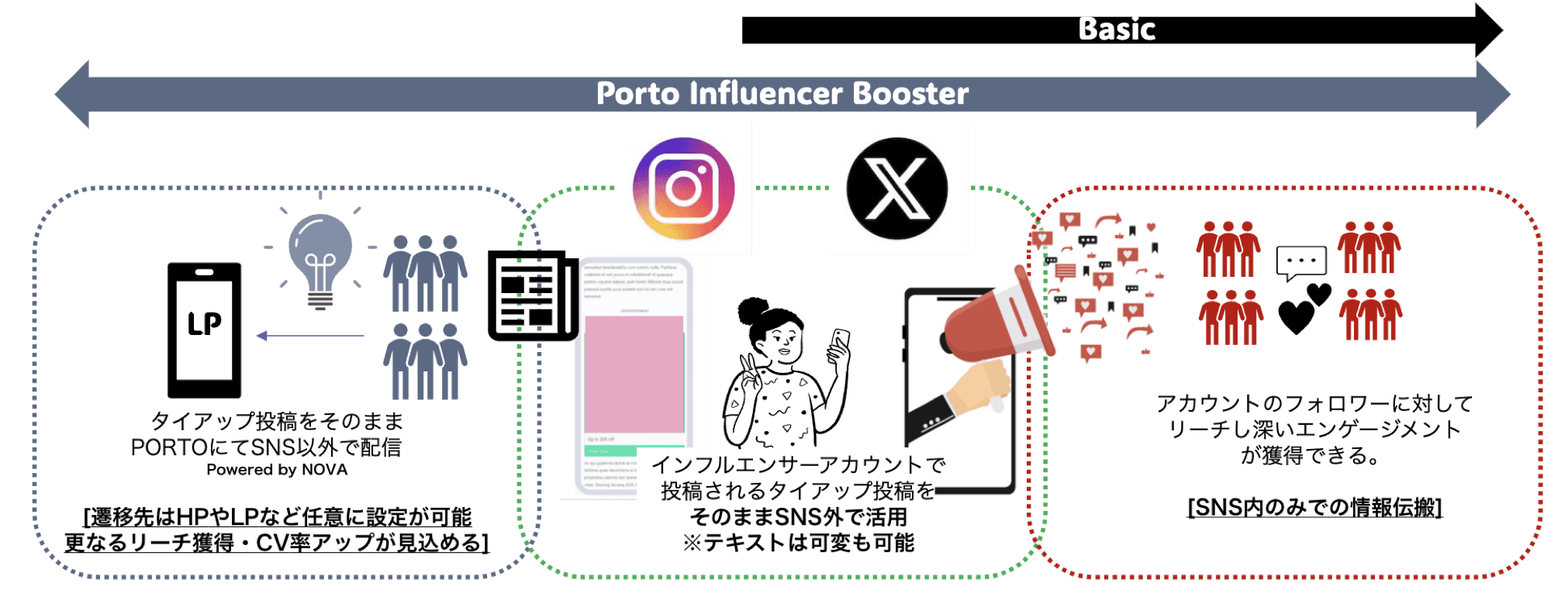 「PORTO Influencer Booster」は、良質なインフルエンサータイアップ投稿をそのままブランド広告主向けアドプラットフォーム「PORTO」(https://portodsp.co.jp/)参画媒体に掲載できるソリューションです。