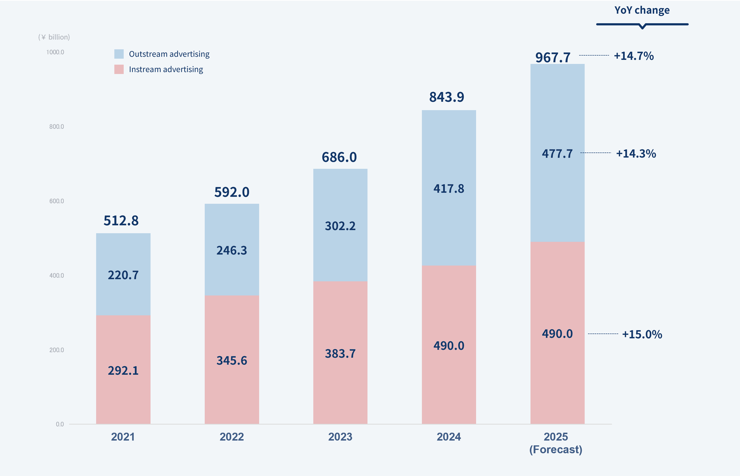 —Video advertisements in 2025 are forecast to grow 14.7% year on year to 967.7 billion yen.—