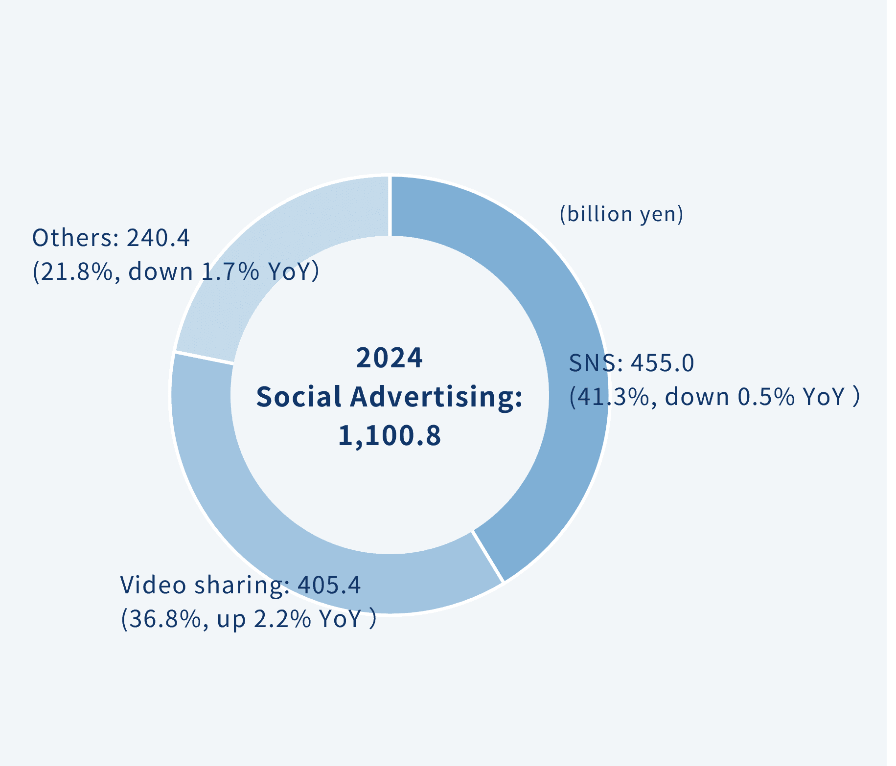 By social media category, SNS (social networking services) amounted to 455.0 billion yen (41.3%) and video sharing saw its share of the total grow year on year to 405.4 billion yen (36.8%), with other categories amounting to 240.4 billion. (Chart 3)