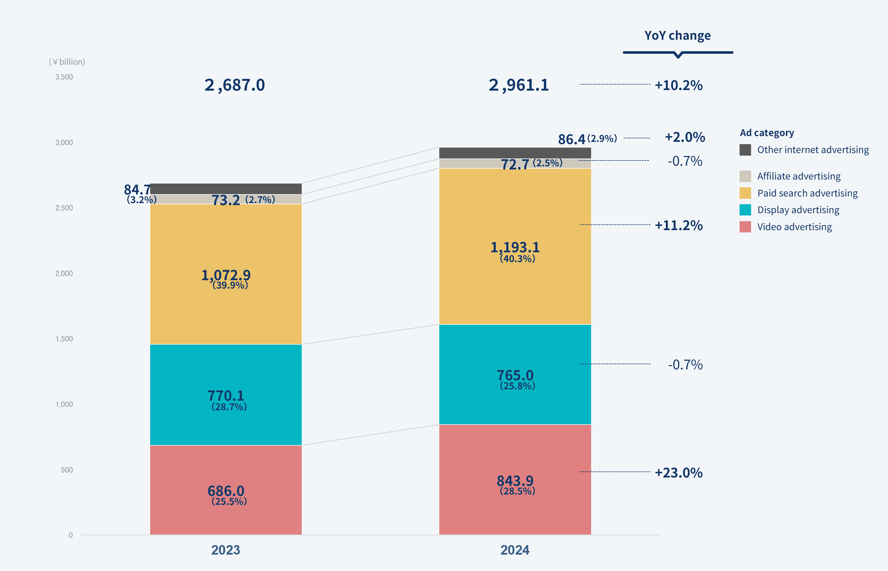 In 2024, internet advertising media expenditures in Japan increased 10.2% year on year to 2,961.1 billion yen (according to “2024 Advertising Expenditures in Japan,” published by Dentsu). By ad type, video advertising posted the highest growth rate, increasing 23.0% year on year to 843.9 billion yen, exceeding display advertising for the first time to account for 28.5% of total advertising media expenditures. Paid search advertising, which exceeded 1,000 billion yen in 2023 for the first time since estimates began, continued its robust growth trajectory in 2024, increasing 11.2% year on year to 1,193.1 billion yen. (Graph 1)