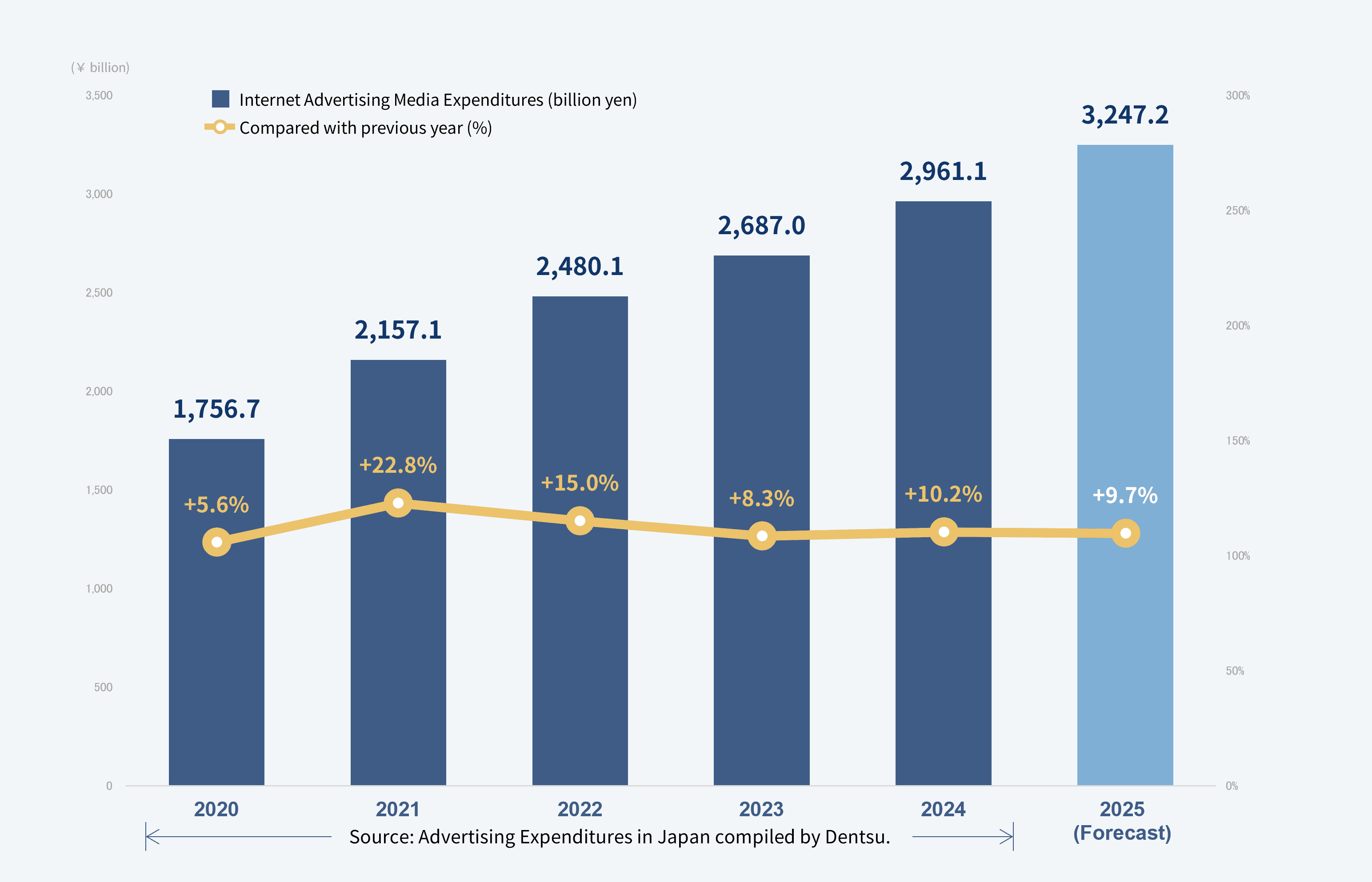 —In 2025, total internet advertising media expenditures in Japan are forecast to increase 9.7% year on year to 3,247.2 billion yen.—