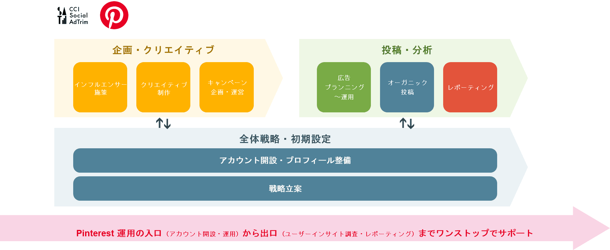 なお、「CCI Social AdTrim for Pinterst」と「Pinterest アド」をあわせて活用することで、企業のPinterest ビジネスアカウントの開設から、広告運用・レポーティングまでをワンストップでサポートすることが可能です。
